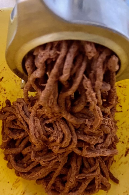 Das ist eine Klippe. Die Auswahl der Gewürze und Geschmackszutaten öffnet ein Riesenarsenal an Möglichkeiten. Am Ende muss ein ausgewogenes Geschmacksverhältnis aus Proteinmaterial, Würzzutaten und Bindemittel hergestellt werden und das endet dann immer mit der Erkenntnis, dass zu den Feststoffen immer noch eine große Menge reines Wasser zugesetzt wird, dass die Mischung auch wirklich stimmt.