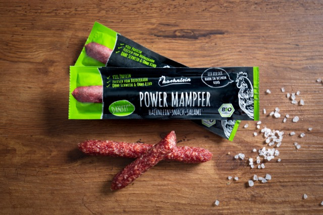Mit seinem Power Mampfer bringt haehnlein seine erste Geflügelsalami aus reinem Bruderhahn-Fleisch auf den Markt. Für den herzhaften Snack werden Bruderhahn-Keulen aus kontrolliert biologischer Haltung zu einer schmackhaften Salami verarbeitet – ganz ohne Zugabe von Schweine- oder Rindfleisch.