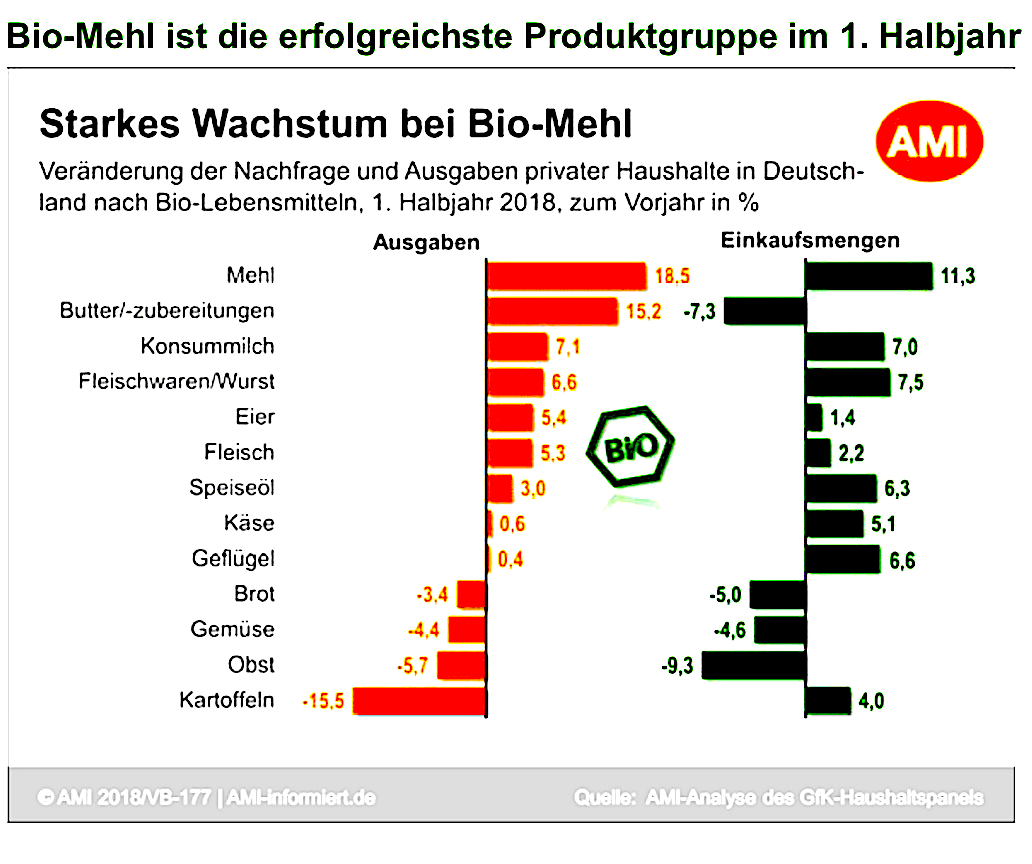Da fängt man in der Überlegung natürlich bei den Trends an, die sich seit 2017 abzeichnen: Das Biowachstum in den einzelnen Vertriebswegen geht immer weiter auseinander: Im Volumenmarkt der Milchprodukte punkten inzwischen die Vollsortimenter. MNur beim Bio-Käse kann der Discount seine Stärken ausspielen. Nur ein kleinerer Teil der Zuwächse geht vermutlich zu Lasten des Fachhandels. Etwas mehr im Wachstumsmarkt von Bio-Fleisch und – Wurst, hier verliert der Fachhandel deutlich und sowohl Vollsortimenter, aber vor allem die Discounter legen kräftig zu. Während Fleisch und Wurst ja immer noch mit Bio-Gesamtanteilen von um die 2 % dastehen, machen die Anteile von Milchprodukten schon 6 – 8 % aus – letzteres bei der Frischmilch – und sind damit ein echter Faktor. Interessant, dass der Fachhandel in einem Kerngebiet der Bioöle seinen Kompetenzvorsprung als Vollsortiment und Discount abgibt. Gerade dieser Markt war in den letzten Jahren für Bioprodukte ein starker Wachstumsträger. Und so kommt es dann auch, dass Biomehl ein sehr starkes Wachstum verzeichnet – bei näherem Hinsehen aber vor allem außerhalb des Fachhandels.