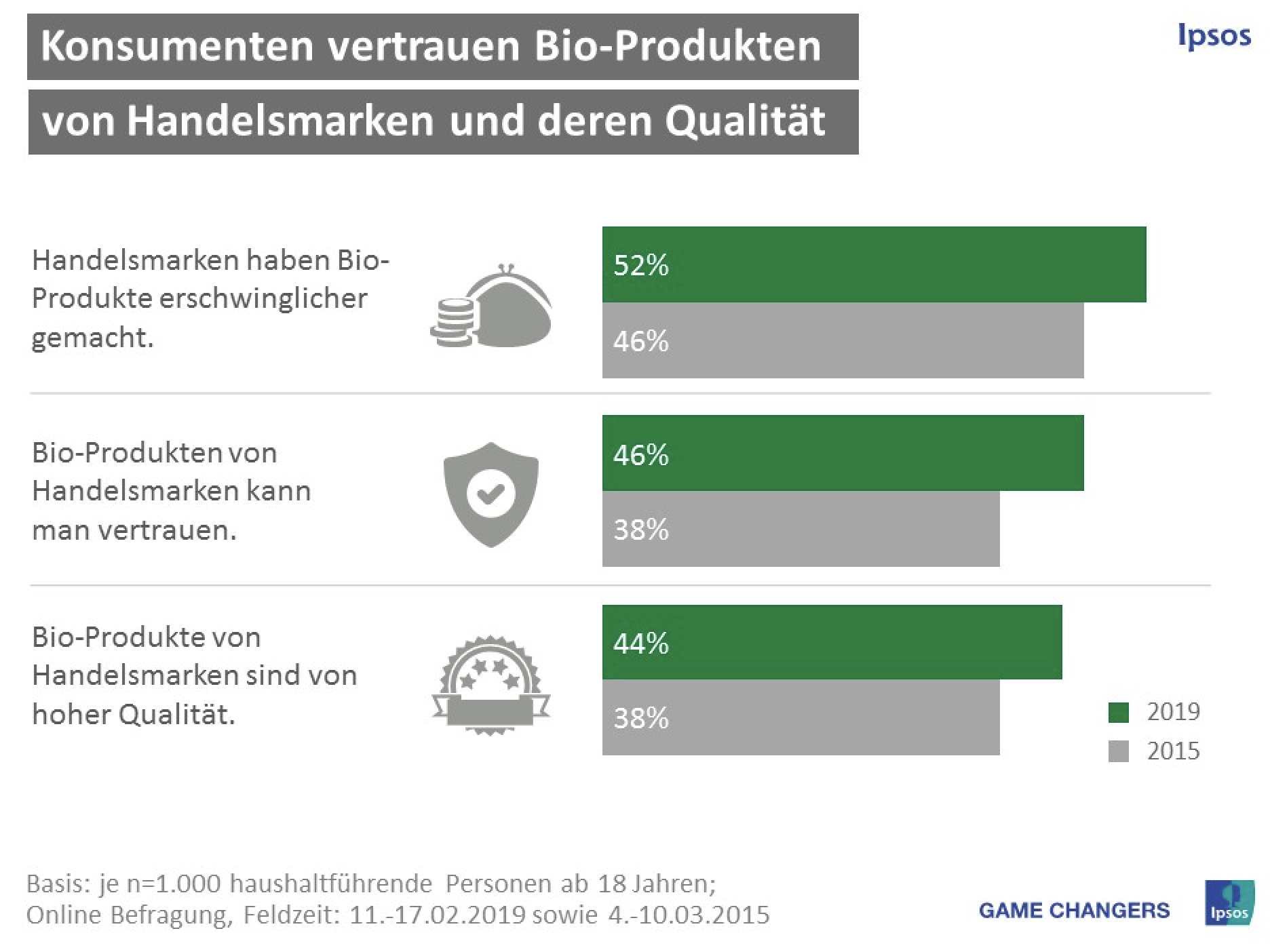 Etwa jeder zweite Konsument (44%) nimmt Bio-Produkte von Handelsmarken als qualitativ hochwertig wahr, etwa ebenso viele (46%) vertrauen diesen Produkten. Das ermittelte der „Handelsmarkenmonitor 2019“, den das Marktforschungsunternehmen Ipsos und die Lebensmittel Zeitung, die in der dfv-Mediengruppe Deutschen Fachverlag GmbH Frankfurt erscheint, bereits im fünften Jahr gemeinsam durchgeführt haben. Die Anzahl der Befragten, die bei Bio-Produkten von Handelsmarken keine hohe Qualität sehen und ihnen nicht vertrauen, ist mit 10 bzw. 11 Prozent relativ gering.