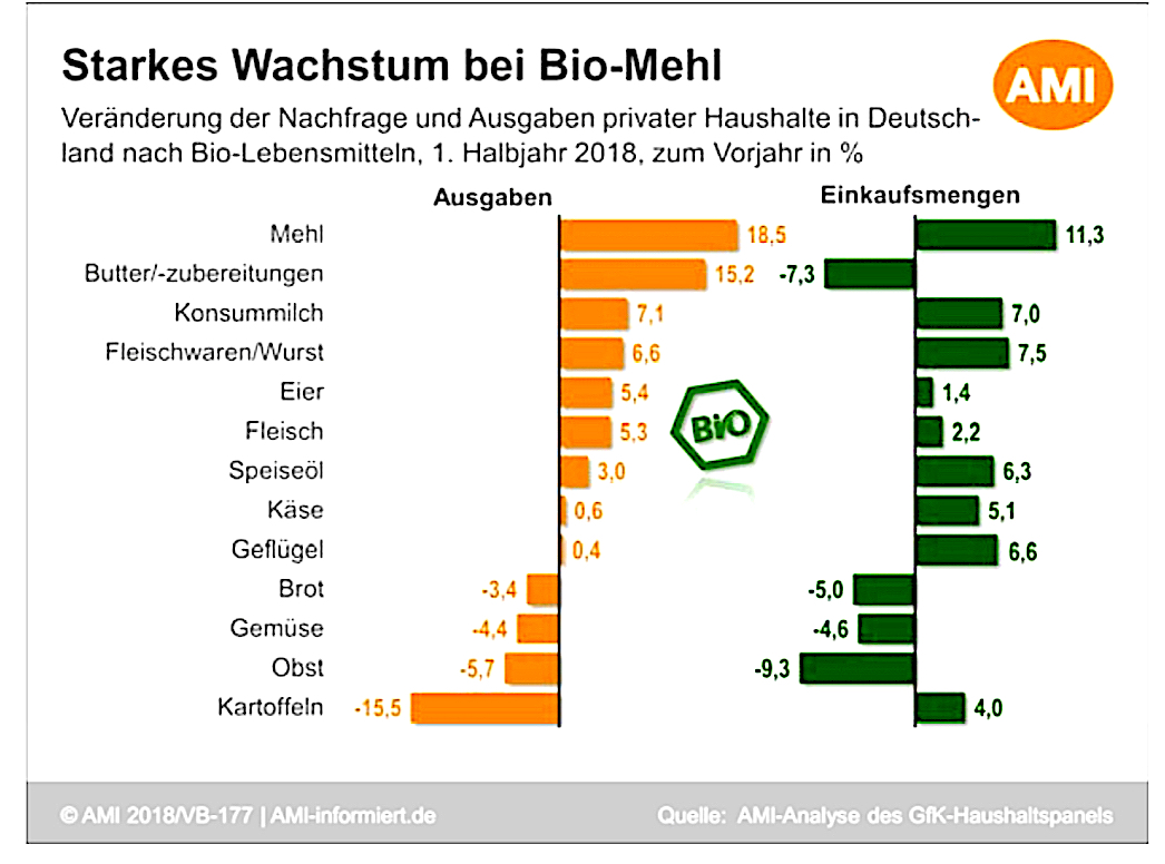Die Discounter und SB-Warenhäuser weiten ihr Bio-Sortiment aus und machen dem Naturkostfachhandel und den sonstigen Einkaufsstätten so immer mehr Konkurrenz, was an den Umsätzen dieser Einkaufsstät- ten schon deutlich spürbar ist. Bio-Mehl und -Butter waren im ersten Halbjahr 2018 insgesamt die erfolgreichsten Produktgruppen, letztere allerdings preisgetrieben. Für Bio-Obst und -Gemüse lief es dagegen weniger gut als in den vergangenen Jahren, so waren bei vielen Kulturen die Erntemengen kleiner, die Preise aber stabil.