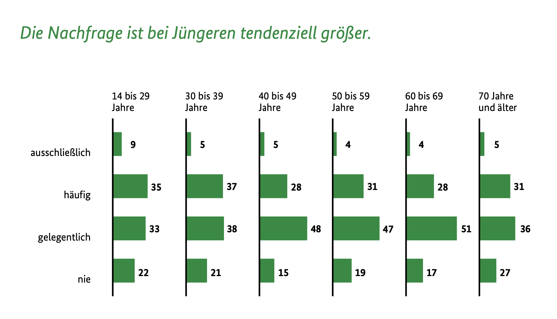 Nach Jahren zeichnet sich inzwischen klar ab, dass der deutliche gestiegene Biosonsum vor allem von den Jüngeren, den unter 40jährigen Konsumenten getrieben wird und hier wiederum von Frauen stärker als Männern. Das ist auch im realen Leben unübersehbar. Dabei sind alle Absichtserklärungen im m er mit Vorsicht zu genießen. Der Konsum von Bioprodukten wurde gerade auch im Corona-Jahr 2020 durch die Überzeugung getragen, dass die Wahl für die Tiere, für Natur und Umwelt wie für die menschliche Gesundheit gleich gut sei. Und genau dafür reicht so ein Meinungsbild wiederum sehr gut, weil es in diesem Bereich sowieso zwecklos ist, Meinungen zu sezieren.