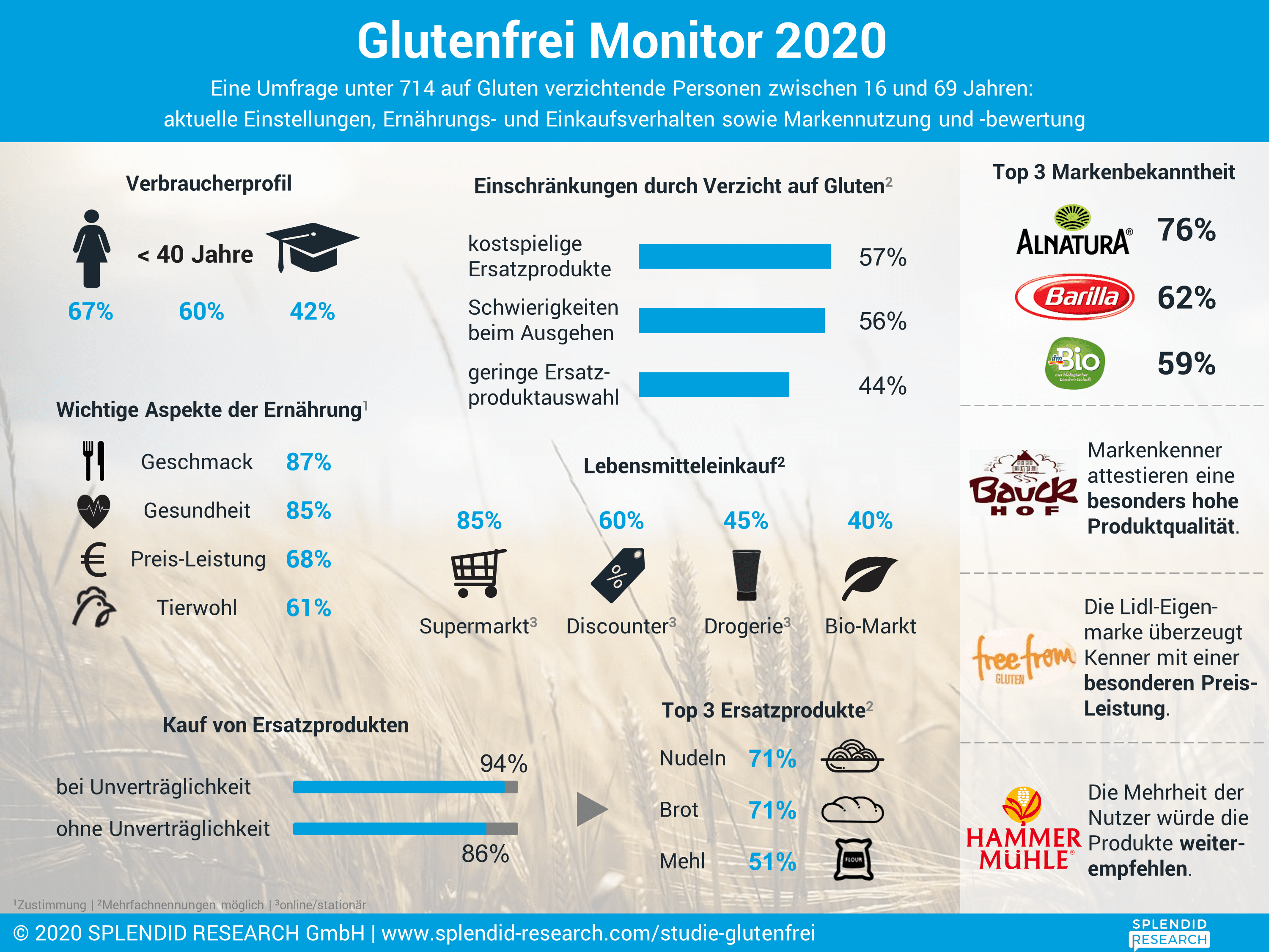 Das Hamburger Marktforschungsinstitut SPLENDID RESEARCH hat im Juni 2020, im Rahmen einer repräsentativen Umfrage, über sein Online-Panel www.befragmich.de 714 in Deutschland lebende und zumindest gelegentlich auf Gluten verzichtende Personen zwischen 16 und 69 Jahren online zum Thema Ernährung befragt. Die Studie erhebt Einstellungen, das Ernährungsverhalten sowie die Nutzung von Ersatzprodukten. Ferner gibt sie detaillierte Einblicke in die Marktposition von insgesamt 20 Herstellern glutenfreier Ersatzprodukte.