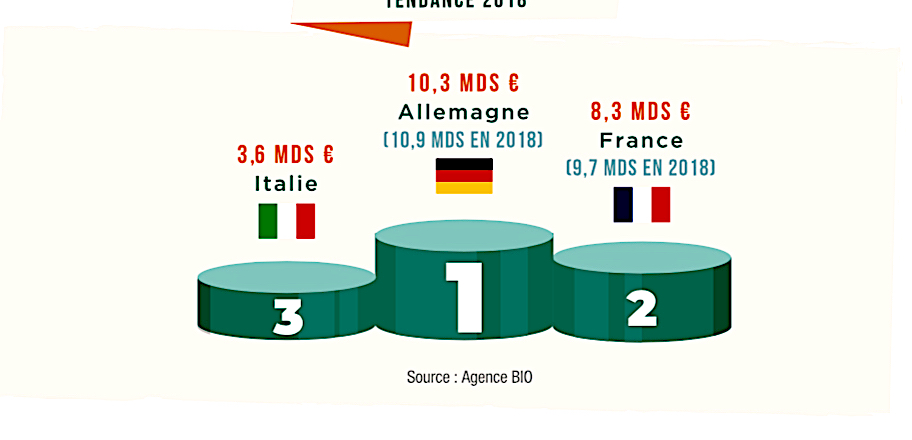 Die Biozahlen aus Frankreich für 2018 wurden schon vor Monaten immer wieder mit zweistelligem Wachstum vermutet. Mit einem Umsatz von 9,7 Milliarden liegt Frankreich in Europa nur noch hinter Deutschland mit einem Umsatz von 10,9 Milliarden und weist damit prozentual zu den Einwohnern einen stärkeren Biokonsum auf als Deutschland. Bei den Lebensmittelausgaben für Bioprodukte erreichen die Bioprodukte inzwischen in Frankreich eben auch
