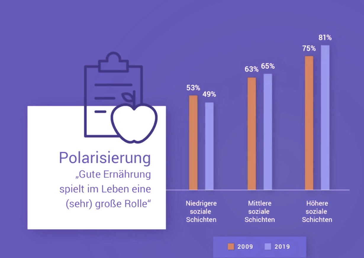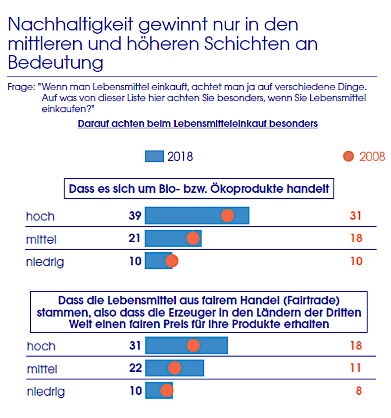 Eine andere Erkenntnis zur gesunden Ernährung bringt uns zum Nachdenken: Der Wunsch nach besserer und gesünderer Ernährung entwickelt sich immer mehr schichtenspezifisch. Die Zustimmung dazu ist bei Besserverdienenden heute über 30% höher. Gegenüber den Werten vor 10 Jahren von 10% weniger Abstand. Gute, gesunde und funktional positive Ernährung scheint immer mehr ein Thema für diejenigen zu werden, die es sich leisten können. Da deutet sich eine neue Teilung in der Ernährung an. Die Zahlen zum Thema Gesundheit in der Ernährung finden sich auch bei der Zustimmung zu Bioprodukten oder fairem Handel.
