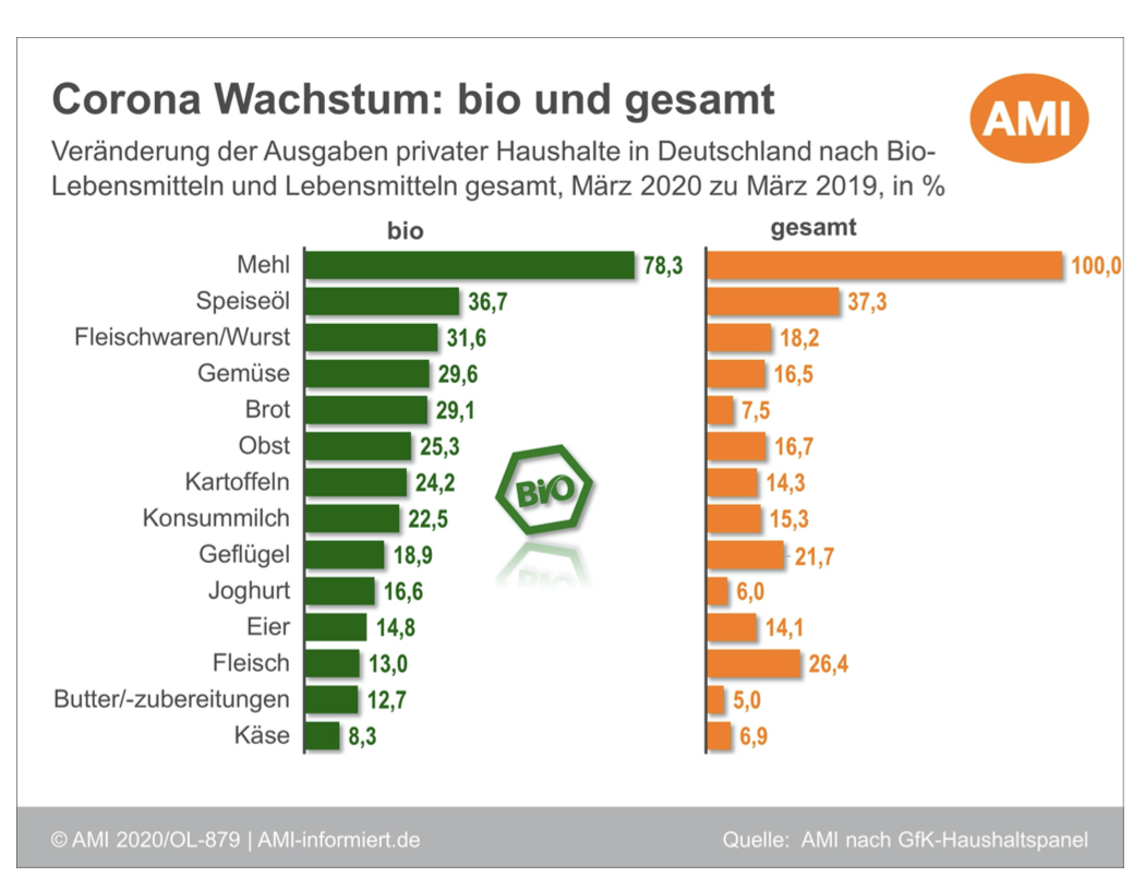 Das hat sich bereits in der ersten Wucht der allgemeinen Krise – ausgelöst in erster Linie durch viele staatliche Maßnahmen und Einschränkungen – bereits abgezeichnet: Die Verbraucher suchen verstärkt nach Formen gesünderer Ernährung. Verständige Verbraucher haben inzwischen begriffen, dass man neben den Hygienemaßnahmen zur Vorbeugung vor allem die körpereigenen Abwehrkräfte stärken kann. Das empfehlen die einschlägigen Virologen zum Beispiel auch Spermidin, was natürlich etwa in Kürbiskernen Brokkoli vorkommt. Wir sehen im Moment, dass der Hang zu Bioqualität vor allem durch frisches Obst und Gemüse angetrieben wird. Wichtige Details über das Marktverhalten der Kunden im Blick auf detailliertere Produktgruppen fehlen.