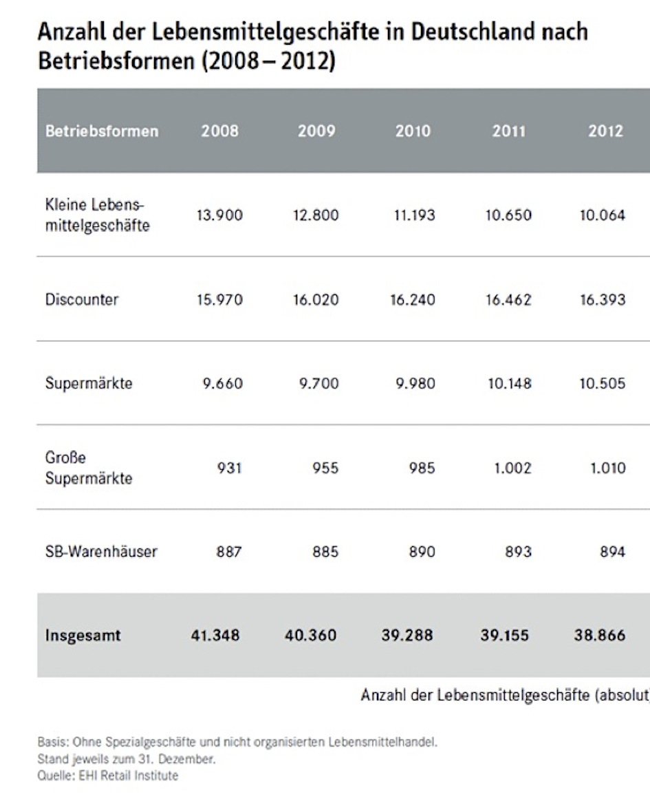 16 393 Filialen der Lebensmitteldiscounter gab es Ende 2012, 10 505 Supermärkte und inzwischen nur 10 064 kleine Supermärkte, 1 010 große Supermärkte und 894 SB-Warenhäuser zusammen knapp 39 000 Märkte. Soweit die aktuellen Zahlen aus dem EHI. In der Betrachtung fehlen die Spezialisten: die Metzger, Bäcker, Bioläden, einige Feinkostanbieter etwa noch einmal 50% mehr. Den Discountern ist offenbar insgesamt kein automatisches Wachstum mehr sicher, aber [...]